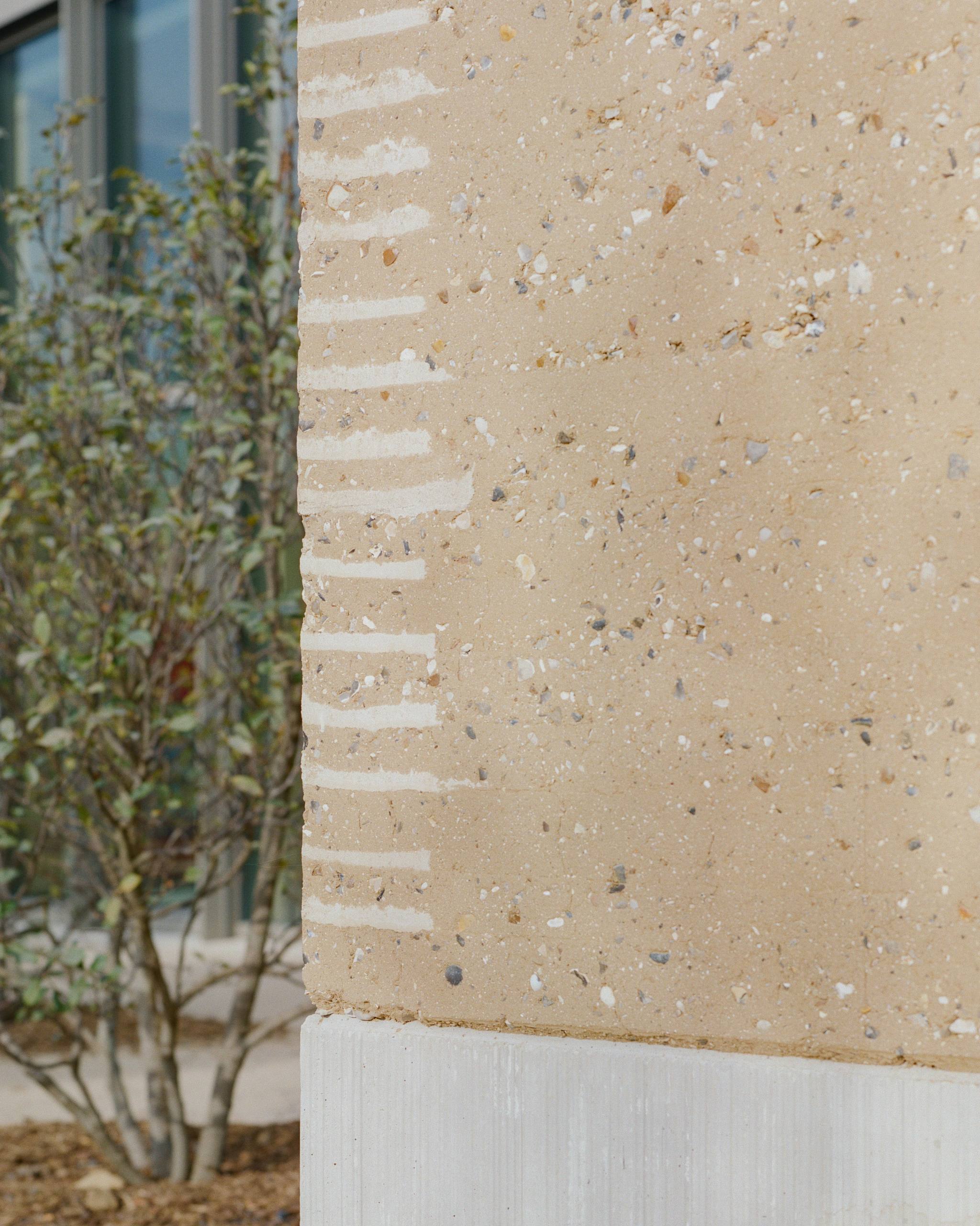 -- Load-bearing rammed earth façades made from excavated material reused from the Grand Paris metro works, drastically reducing embodied carbon and transport impacts.