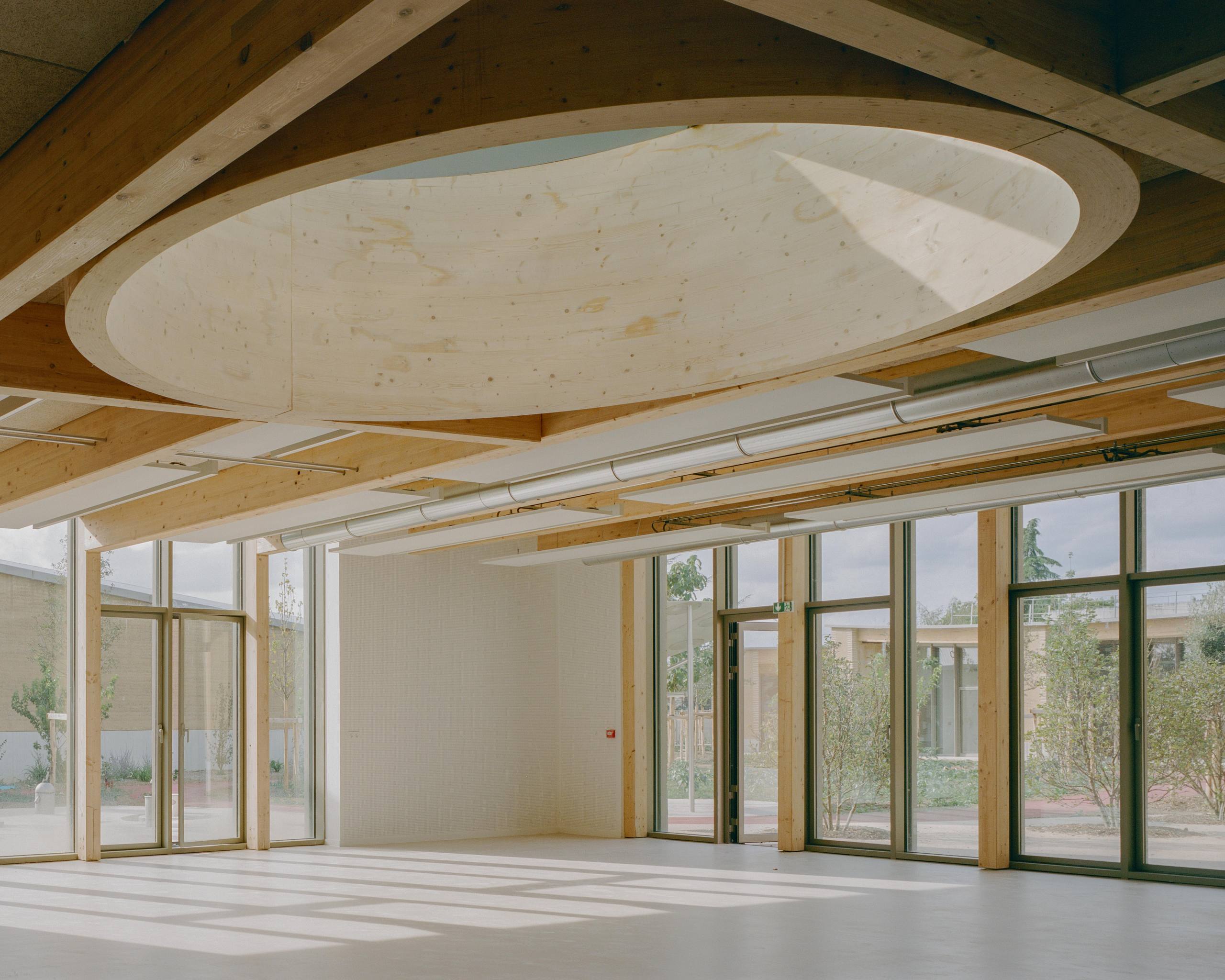 material. In Evry-Courcouronnes (Greater Paris – France), the Parc des Loges Childhood and Sports Center fully embodies this philosophy: a gentle, landscape-based composition built from bio- and geo-sourced materials, serving a public facility that is open, generous, and sustainable.